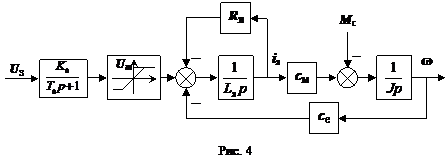 На рис. 4 приняты следующие обозначения: U з – напряжение задания скорости вращения исполнительного двигателя, вырабатываемое задающим устройством; K у и Т у – коэффициент передачи по напряжению и постоянная времени усилителя мощности; U m – максимальное выходное напряжение усилителя мощности; R я, L я – сопротивление и индуктивность обмотки якоря двигателя; i я – ток якоря; с м – коэффициент момента; c е – коэффициент противо-ЭДС; M с – момент сопротивления вращению двигателя; J – момент инерции вращающихся частей, приведенный к валу двигателя; ω – скорость вращения двигателя. Математическая модель системы регулирования скорости вращения исполнительного двигателя, построенной по принципу регулирования по отклонению, в виде структурной схемы представлена на рис. 5.