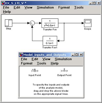 Рис. 1. Исследуемая модель и окно Model_Inputs_and_Outputs инструмента Simulink 2. Установить блок Input Point на входе и блок Output Point на выходе исследуемой системы, как это показано на рис. 2. 3. В меню окна LTI Viewer выбрать команду Simulink и в выпадающем меню выбрать команду Get Linearized Model. Данная команда выполняет линеаризацию модели и строит реакцию системы на единичное ступенчатое воздействие. Результат выполнения данного пункта показан на рис. 3.