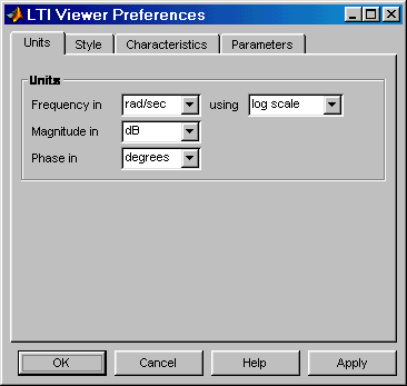 Для настройки инструмента Simulink LTI-Viewer (установки или изменения единиц измерения, установки стиля графиков, установки интервалов времени и частот и т.д.) необходимо в меню окна LTI-Viewer выбрать Edit и в выпадающем меню выбрать команду Viewer Preferences. С помощью данной команды выполняются следующие виды настройки: 1. Установка единиц измерения (вкладка Units). Вид окна при настройке единиц измерения показан на рис. 6. Вкладка Units окна позволяет задать единицы измерения частоты (рад/c или Гц), уровня (dB или абсолютные единицы), фазы (градусы или радианы), а также установить вид шкалы частоты (логарифмический или линейный).