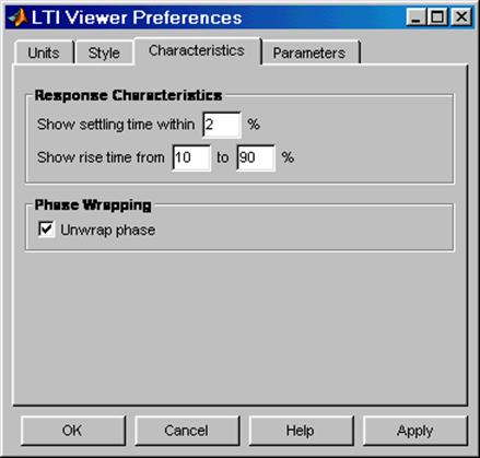 2. Установка стиля графиков (вкладка Style). На данной вкладке можно выполнить настройку шрифтов окна Simulink LTI-Viewer (панель Fonts), выбрать цвет осей графиков (панель Colors), а также задать нанесение линий сетки на графики (флажок Show grids). Внешний вид вкладки Style показан на рис. 7. 3. Установка параметров расчета переходного процесса (вкладка Characteristics). Данная вкладка позволяет задать параметры установленные "по умолчанию" для вычисления времени нарастания и времени переходного процесса. По умолчанию Simulink LTI-Viewer вычисляет время переходного процесса как время, когда переходная функция входит в 2% зону и больше не выходит из нее (параметр Show setting time within). Также можно изменить параметры для вычисления времени переходного процесса (Show rise time from). На данной вкладке имеется также флажок Unwrap phase, установка которого позволяет избежать отображения разрывов в фазо-частотной характеристике, связанных с областью определения функции arctg, вычисляющей фазовый сдвиг. Внешний вид вкладки Characteristics показан на рис. 8.