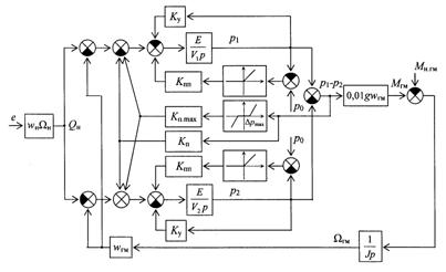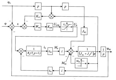 По уравнениям (1) – (6) составлена структурная схема системы стабилизации, приведенная на рис. 2. Для повышения точности стабилизации ИУ при качке основания используется сигнал абсолютной скорости ИУ, измеряемый гироскопическим датчиком скорости. Структурная схема системы стабилизации с введением обратной связи по абсолютной скорости ИУ приведена на рис. 3.