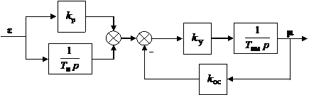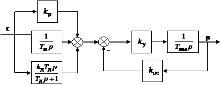 Рис. 3. Структурные схемы ПИД-регуляторов: а – Для получения П-закона регулирования усилитель и исполнительный механизм охватываются отрицательной обратной связью (см. рис. 4). Передаточная функция регулятора Параметром настройки регулятора является коэффициент передачи k ос.