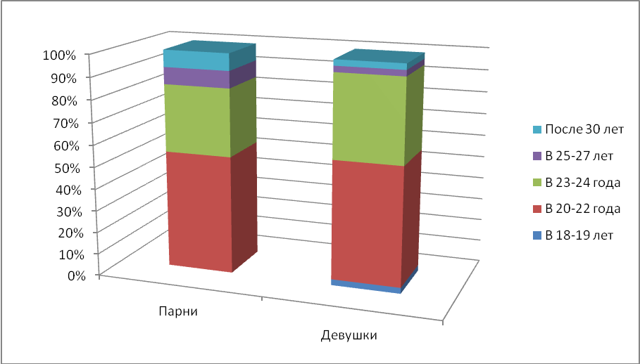 1. Задача первая. Выяснение мнений молодежи о предпочтении времени появления ребенка. Для решения первой задачи исследования было проведено социологическое исследование среди девушек и парней разных возрастов.