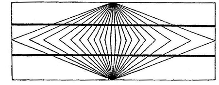 На рис. 3.4.24 средние линии кажутся слегка сходящимися к концам и расходящимися в середине. На самом деле они параллельны. Острые углы переоцениваются, и угол А-а как бы раздвигается, и сторона «а» отклоняется книзу. Недооценка тупого угла иллюстрируется рис. 3.4.25. В нем параллельные линии кажутся слегка расходящимися у правого конца. Если есть две параллельные линии и множество число линий, образующих острые углы, иллюзия может чрезвычайно усилиться (рис. 3.4.26). И параллельные линии здесь кажутся изогнутыми и расходящимися в середине. Если же изменить положение углов, то можно получить обратный результат и линии будут казаться сближающимися к середине фигуры (рис. 3.4.27). Аналогичный результат наблюдается на рис. 3.4.28 с двумя вариантами фигуры. Иллюзия острого угла, его переоценка приводит к такому явлению, когда вертикальные параллельные линии, пересекаемые короткими косыми, кажутся расходящимися.
