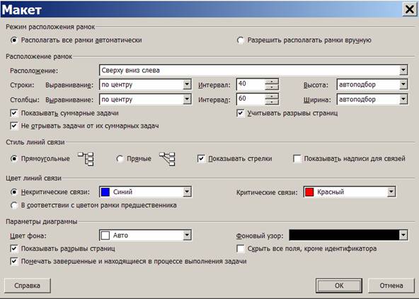 Окно макета открывается пунктом меню Формат/Макет (Макет из контекстного меню области графика) приведено на рис. 4.21. Пункт меню Формат/Стили рамок (Стили рамок из контекстного меню области графика) открывает окно настройки изображений рамок для различных видов задач, изображенное на рис. 4.22. В этом окне для задач различных видов, перечисленных в поле Параметры стиля для можно выбрать шаблон данных (перечень информации внути рамки) и способ изображения границы и фона самой рамки. Установки данного окна распространяются на все задачи заданного вида. Если необходимо изменить формат только одной отдельной выделенной рамки, для этого используется пункт меню Формат/Рамка (Формат рамки из ее контекстного меню). Состав настраиваемых параметров в этом случае аналогичен параметрам окна рис. 4.21.