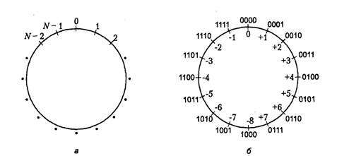Итак, вы уже знакомы с тремя системами представления положительных и отрицательных чисел, или, проще говоря, чисел со знаком. Эти системы различаются только способами представления отрицательных значений. Их сравнительные преимущества с точки зрения выполнения арифметических операций можно определить так: простейшая с точки зрения представления чисел система значения со знаком наименее удобна для их сложения и вычитания. Система дополнения до единицы несколько лучше. А наиболее эффективной с точки зрения выполнения указанных операций является система дополнения до двух. Чтобы понять принципы арифметики дополнений до двух, нужно рассмотреть операцию сложения по модулю N (обозначаемую как mod N). Удобным графическим представлением сложения положительных чисел по модулю N является круг с N значениями по его периметру: от 0 до N - 1 (рис. 4.2, а). Для примера рассмотрим значение N = 16. Результатом операции (7 + 4) mod 16 является значение 11. Для того чтобы выполнить эту операцию с помощью графического представления, найдите на окружности отметку 7 и переместитесь от нее на четыре деления по часовой стрелке. Там вы найдете ответ — значение 11. Аналогичным образом (9 + 14) mod 16 = 7. Найдя значение 9 и отсчитав от него 14 делений, вы опишете полный круг и остановитесь на делении 7. Этот нехитрый графический прием позволяет вычислить любую сумму (а + b) mod 16 для любых положительных чисел а и b: вы находите число а и перемещаетесь на b делений по часовой стрелке. Теперь рассмотрим другую интерпретацию окружности mod 16. Предположим, что значения из диапазона от 0 до 15 представлены в соответствии с двоичной системой счисления 4-битовыми двоичными векторами: 0000, 0001,..., 1111. А двоичные векторы, как видно на рис. 4.3, б, представляют числа со знаком от -8 до +7, что соответствует системе дополнения до двух (рис. 4.1). Давайте применим графическую технологию сложения по модулю 16 к простому примеру сложения чисел +7 и -3. В системе дополнения до двух эти числа представлены как 0111и1101 соответственно. Для того чтобы их сложить, найдите на окружности число 0111 и переместитесь на 1101 шагов по часовой стрелке (то есть на 13 шагов — сосчитайте количество делений от 0 до 1101). Вы окажетесь на делении 0100, представляющем ответ, а именно +4 (рис. 4.2, б). Если вы выполните эту операцию путем сложения пар разрядов справа налево, результат будет таким: + 1101 1 0100 ↑ Перенос Как видите, для получения правильного результата мы проигнорировали перенос из четвертого разряда. В этом и состоит суть сложения по модулю. Перемещаясь по кругу (рис. 4.2, 6), мы возвращаемся не к значению 10000, следующему за значением 1111, а к значению 0000.