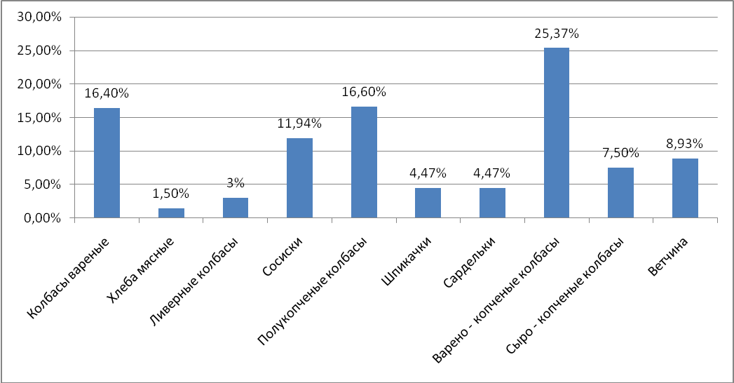 Рисунок 9 Гистограмма структурыассортимента по виду колбасных изделий Из данных гистограммы представленной на рисунке 9 следует, что большую долю в структуре ассортимента колбасных изделий магазина «Дикси» занимают варено – копченые колбасы (25,37%), на втором месте полу копчёные колбасы (16,6%), и с небольшим отрывом 16,4% в структуре ассортимента занимают вареные колбасы. Из данной гистограммы видны предпочтения покупателей, по более популярным видам колбас ассортимент расширен, а у колбасных изделий пользующихся наименьшим спросом ассортимент не большой, например доля мясных хлебов в структуре ассортимента составляет 1,5%, ливерные колбасы 3%, шпикачки и сардельки по 4,47%. Теперь рассмотрим более подробно структуру ассортимента по виду реализуемых вареных колбасных изделий в таблице 12, составленной на основе данных планограммыколбасного отдела магазина «Дикси» из приложения Ц.