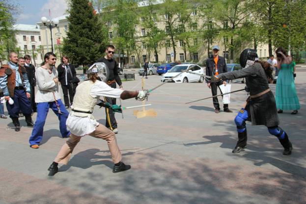 Бой в номинации «Шпага и дага». Александр Макаров – Никита Погорелов. Дуэльное фехтование – это соревнование, моделирующее дуэльный поединок в том виде, в котором он существовал в Европе в 16-19 веках. Наше снаряжение имеет массу и габариты оружия, которая действительно существовало, поэтому требования к физической подготовке довольно серьезные. У нас зачитываются только удары, которые действительно являются ударами, поэтому, хотя травмы случаются не чаще, чем в футболе, синяки и ушибы – наши лучшие друзья. Ради сохранения рисунка боя мы жертвуем объективностью: электрофиксацию в дуэльном фехтовании представить сложно. Поэтому с одной стороны корректность подсчета очков зависит от четырех боковых судей, которые не всегда объективны, с другой – никакие провода из-под куртки не торчат, и поединки проводятся не на дорожках, а на полноценном ристалище.
