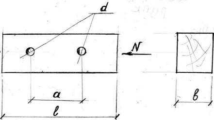Рис. 1 Решение. Несущую способность элемента при заданных условиях задачи вычисляем по формуле N = т0 тп тв R р Aнт где т 0 - коэффициент, учитывающий наличие ослаблений, равен 0,8; т п - коэффициент перехода на породу дерева, для лиственницы равен 1,2 [1, табл. 4]; т в - коэффициент, учитывающий условия эксплуатации (группу конструкций), равен 1,0 [1, табл.5]; Rр - расчетное сопротивление древесины (сосны, ели), принимается по [1, табл. 3 п. 2. а] и равно 10 МПа. Для вычисления Aнт выбираем самый опасный участок, где на расстоянии 200 мм имеет место наибольшая площадь ослаблений (не попадающих при перемещении вдоль волокон одно на другое). Такой участок будет на участке с отверстиями 1, 2 и 3. Ант = bh - 3db = 20•15 - 3•1,6•15 = 228 см2. Несущая способность растянутого элемента N = 0,8•1,2•1,0•10•0,0228 = 0,21888 мН = 218,88 кН. Задача 2. Найти несущую способность центрально-сжатого стержня Исходные данные: h = 200мм;b = 150мм; а=150мм; ℓ =3000мм; d=40мм; материал - пихта; сорт древесины 2; условия эксплуатации А3; условия закрепленияконцов стержня в плоскостях х-х и у – у: шарнирное (Ш-Ш).