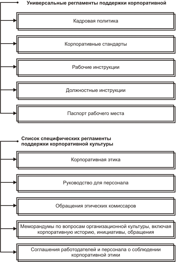 Рис. 6. Виды регламентов поддержки организационной культуры Важно разработать логически выверенную структуру регламентов. Часто бывает, что разработчики документа не могут обосновать смысл того или иного его раздела. В частности, такой основополагающий документ поддержки организационной культуры как «Корпоративная этика», грешит перенасыщенностью в части описания правил поведения и, одновременно, недостаточностью в тех разделах, которые будут обеспечивать поддержку этих же самых правил. Мы предлагаем следующую структуру данного документа, не претендуя при этом на незыблемость выделения разделов, но пытаясь достичь выполняемости положений документа (таблица 2). Таблица 2. Структура и содержание документа «Корпоративная этика»