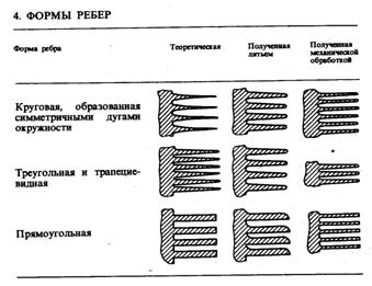 Удельные количества других жидкостей, прокачиваемых через систему охлаждения, меняются обратно пропорционально их теплоемкостям. Сечения трубопроводов выбирают по расчетным скоростям в линиях (1-3 м/с во впускных и 2-6 м/с во вспомогательных). Удельная вместимость систем охлаждения составляет 0,16-2,1 л/кВт и более. Удельные массы и габаритные размеры двигателей воздушного охлаждения будут тем меньше, чем большей будет теплоотдача с единицы массы ребер. Теоретически наиболее целесообразно использовать ребра с вогнутыми параболическими поверхностями и с толщиной у концов, равной нулю. Из соображений обеспечения необходимой прочности ребер и техно- логичности от этой формы отступают и изготовляют ребра, форма которых показана в табл. 4. Наибольшее распространение получили ребра трапециевидной, треугольной с углом 3-5° и прямоугольной формы с