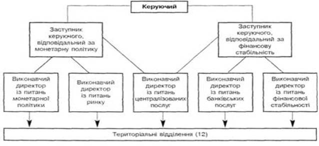 Структура Банку Англії Після травня 1971 р. колишні коефіцієнти було скасовано. Банківські ставки за позиками більше не були прив'язані до дисконтної ставки Банку Англії і визначалися на підставі базової ставки, яка повідомляється кожним банком індивідуально. Було встановлено коефіцієнт резервних активів для комерційних банків у розмірі 12,5 суми короткострокових депозитів. Крім того, банки повинні були зберігати суму в 0,5% своїх короткострокових депозитів на безпроцентному рахунку в Банку Англії. Після 1981 р. Банк Англії став акцентувати свою увагу на операціях із державними цінними паперами (операції на відкритому ринку)- Коефщієнт резервних активи} був відмінний, але комерційні банки мати зберігати 2,5% суми короткострокових зобов'язань у вигляді резерву на рахунках в облікових домах, з якими вони пов'язані кредитними відносинами. Структура балансу Банку Англії своєрідна. Банк поділений на два департаменти — емісійний і банківський. Емісійний депортамент займається випуском банкнот під державні цінні папери, що знаходяться в портфелі банку. Банківський департамент видає позички комерційним банкам за дисконтною ставкою за рахунок власних депозитів. Ця система тісно пов'язана з міжнародним ринком позичкового капіталу. Велика Британія стала прикладом країни, в якій до останнього часу не було спеціальних законів, які регламентували б роботу банків, а контроль над ними має неформальний характер. Банки тут регулюються загальним законом про акціонерні товариства. З 1979 р. відповідно до національного законодавства запроваджено обов'язкове ліцензування комерційних банків й утворено загальнонаціональний фонд страхування депозитів. Наступний банківський закон 1987 р. визначив правила видачі великих позик, порядок банківських злиттів, аудиторських перевірок тощо. Але контроль за банківською діяльністю у Великій Британії залишається менш формальним і суворим, ніж в інших країнах. Банк Англії формально незалежний від уряду, хоча працює під керівництвом Міністерства фінанси}. Термін повноважень керуючого Банку Англії не залежить від зміни уряду. Організаційна структура Банку Англії подана нижче (рис.5). Рисунок 5
