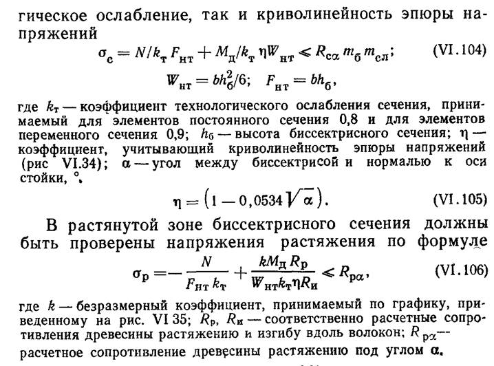 Дощатоклееные рамы из прямолинейных элементов (рис. VI.33, а —VI.33, е) более технологичны, чем дощатоклееные гнутые рамы, так как на заводе собирают и склеивают из прямолинейных досок отдельно стойку и ригель каждой полурамы. Наиболее сложным у рам П-образного очертания является карнизный узел (соединение стойки с ригелем), где действует' максимальный изгибающий момент. Рамы пролетом 12 и 18 м иногда проектируют с карнизным узлом, решенным с помощью косынок из фанеры марки ФСФ или лучше бакелизированной ' (рис. VI.33, в). Фанерные косынки, приклеиваемые к стойке и ригелю, перекрывают стык, воспринимая нормальное усилие и изгибающий момент. Клеевой шов проверяют на скалывание. Недостаток такого решения — возможность разрушения клеевого шва при усушке и разбухании пакета досок, приклеенного к фанерной косынке больших размеров. В последнее время шире применяют соединение стойки с ригелем на зубчатый шип (рис. VI.33,г). Более надежны рамы из прямолинейных элементов с ригелем, имеющим консоли и опирающимся шарнирно на стойки и подкосы (рис. VI.33, д, е). Элементы таких рам работают как сжато-изгибаемые стержни и должны быть рассчитаны на действующие в сечениях нормальные усилия, изгибающие моменты и поперечные силы. Получили применение в строительстве рамы с соединением ригеля в карнизном узле на зубчатый шип. Расчет этих рам производят на прочность и устойчивость плоской формы деформирования. При проверке напряжений по биссектрисному сечению, в котором элементы соединяются на зубчатый шип, учитывают как техноло- 1 Предложены и осуществлены С. Е. Штейнбергом.