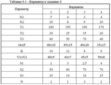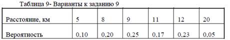 Служба заказа такси имеет N1 каналов дня одновременного приема заказов по телефону. Интервалы времени между попытками вызова такси распределены по закону Эрланга второго порядка со средним T1 секунд. Абонент затрачивает T2 секунд на набор номера. Если он застает все каналы заказа занятыми или после соединения выясняет, что очередь на обслуживание превышает N заказов (в таком случае заказы не принимаются), то через T3 секунд он повторяет набор. После K попыток абонент прекращает набор. Служба заказа имеет в своем распоряжении N2 машин для обслуживания пассажиров. Время,затраченное для проезда к клиенту, зависит от расстояния. Распределение расстояния приведено в табл. 9. Стоимость проезда к клиенту недоплачивается. Скорость движения машины равномерно распределена в интервале V1±V2 километров в час (табл. 9.1). Время обслуживания клиента равномерно распределено в интервале T4 ± T5 минут. Стоимость предварительно заказа составляет S1 рублей, стоимость проезда 1 км равна S2 копеек табл. 9.1 Найти оценку интервала времени выполнения заказа (время от момента заказа такси до момента доставки клиента на место). Считая, что операторы-телефонисты и водители такси взаимозаменяемы, перераспределить их между участками работы так, чтобы минимизировать время выполнения заказов (штат службы не должен превышать N1 + N2 человек). Определить такое количество операторов на телефонах и водителей такси, при которых прибыль службы за сутки работы (суточная заработная плата каждого из работников составляет S3 рублей) будет максимальной.