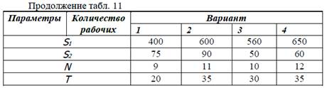 На участок поступают пуассоновские потоки узлов двух типов с параметрами λ1 мин-1 и λ2 мин-1 для первого и второго, соответственно (табл. 11). Первая операция - операция предварительной подгонки - начинается в том случае, если в наличии есть по одному узлу каждого типа и завершена подгонка предыдущих узлов. Длительность этой операции Т1 минут. Дальше с вероятностью p1 над узлом первого типа и р2 над узлом второго типа производится операция доводки, которая длится Т2 и Т3 минут, соответственно. После этого узлы поступают на операцию сборки, которая начинается после поступления узлов обоих типов, которые ранее были взаимно подогнаны. Сборка длится Т4 минут. Длительность каждой операции зависит от количества задействованных на ней рабочих. Всего на участке может быть задействовано не более N рабочих. Прибыль от реализации одного готового изделия составляет S1 единиц стоимости, но, если после завершения подгонки узлов до момента их сборки проходит более T минут, прибыль от реализации изделия уменьшается вдвое. Заработная плата каждого рабочего - S2 единиц стоимости в час. Определить такое количество занятых в производстве рабочих и их распределение между операциями, которое бы обеспечило максимальную экономическую эффективность производства.