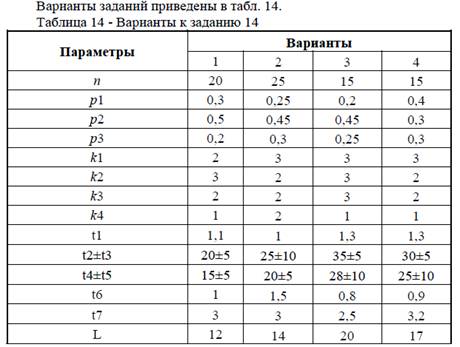Задание 14 Поток требований на получение книг в библиотеке - пуассоновский с интенсивностью n требований в час. Требования принимает один библиотекарь. Прием требований занимает интервал времени, распределенный по экспоненциальному закону со средним временем t1 минут. С вероятностью p1, приходят требования на научную литературу, с вероятностью р2 - на художественную литературу, с вероятностью р3 - на периодические издания. Соответственно типу запросы направляются в отделы научной, художественной литературы и периодических изданий. В этих отделах работают, соответственно, k1,k2 и k3 человек. Время поиска книги составляет t2 ± t3, минут в научном и художественном отделах, а время поиска литературы в отделе периодических изданий – t4 ± t5 минут. Потом заказанная литература приходит в отдел выдачи литературы, где работает k4 библиотекарей. Заказы на периодические издания имеют больший приоритет, нежели на научную и художественную литературу, а заказы на художественную и научную одинаковый приоритет. Время выдачи литературы распределено равномерно в интервале t6 - t7 минут. Найти оценку среднего времени выполнения заказа. Определить количество библиотекарей в каждом отделе, при котором среднее время выполнения требований было бы минимальным, учитывая, что общее количество библиотекарей не должно превышать L человек.