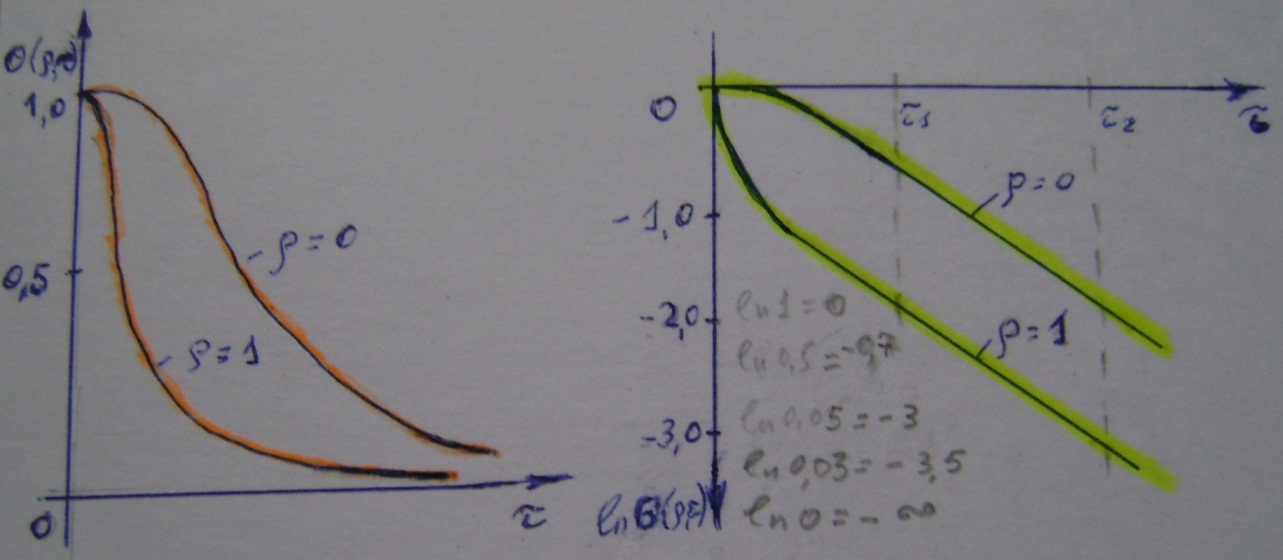 Если нет тепловой емкости внутри При значениях критерия безразмерного времени, критерия ФурьеFo = Θ(ρ,τ) = где А1- определяется из (32)при значении первого корня ɛ1и не зависит от координаты ρ и времени τ, зависит только от a, bи интенсивности внешнего и внутреннего теплообмена – критерия Bi = αb/λ, величины присоединенной внутри тепловой емкости С0; m = (Уже при втором значении корня ɛ2, лежащем в области (π -2π), что показано на рис.2 выше, при Fo=1/3exp(- После логарифмирования (34) lnθ(ρ,τ) = ln