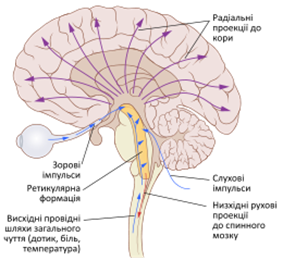 Ядра СУ виділяють в окрему неспецифічну полісинаптичну систему; Так тонізуючі впливу СУ поширюються на всі без винятку зони кори великих півкуль через сітчасто-таламо-кортикальні шляхи (неспецифічні аферентні кіркові волокна), утворюючи висхідну активуючу систему; Нейрони СУ отримують інформацію від усіх сенсорних систем завдяки колатералям від висхідних шляхів; Спинномозково-ретикулярні шляхи закінчуються у присередній частині СУ.
