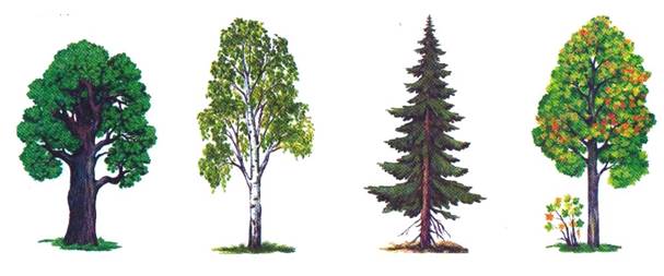 Описывать деревья (кустарники) по вопросам: - название; дерево или кустарник? - какой у дерева ствол? (толстый, тонкий, высокий, низкий...) - какая у дерева кора? (темная, светлая, гладкая, шершавая...) - какой формы листья? (круглые, овальные, резные, вытянутые, иголки...).