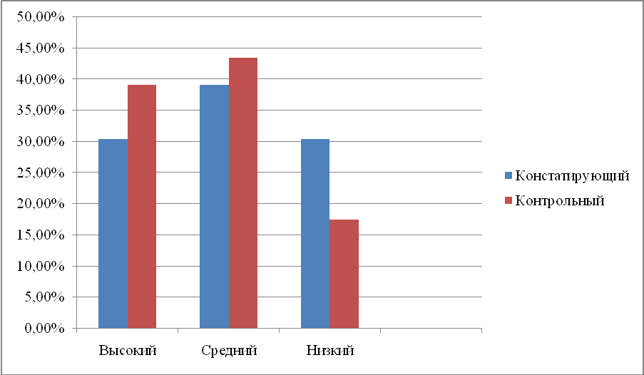 Нами было проведено сравнение результатов констатирующего и контрольного этапов эксперимента. Так как личностные результаты не оцениваются на каждого ученика, а представляются в общем на класс, то мы будем сравнивать только общие результаты. Все данные занесены в таблицу 5. Таблица 5. Результаты сравнения констатирующего и контрольного этапов
