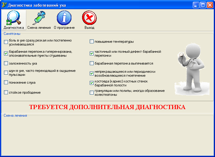 Листинг программы unit main; interface uses Windows, Messages, SysUtils, Variants, Classes, Graphics, Controls, Forms, Dialogs, ToolWin, ActnMan, ActnCtrls, XPStyleActnCtrls, ActnList, StdCtrls, ExtCtrls, ImgList, XPMan, ComCtrls; type TForm1 = class(TForm) ImageList1: TImageList; ToolBar1: TToolBar; ToolButton1: TToolButton; ToolButton2: TToolButton; ToolButton3: TToolButton; ToolButton4: TToolButton; XPManifest1: TXPManifest; GroupBox1: TGroupBox; CheckBox1: TCheckBox; CheckBox2: TCheckBox; CheckBox3: TCheckBox; CheckBox4: TCheckBox; CheckBox5: TCheckBox; CheckBox6: TCheckBox; CheckBox7: TCheckBox; CheckBox8: TCheckBox; CheckBox9: TCheckBox; CheckBox10: TCheckBox; CheckBox11: TCheckBox; CheckBox12: TCheckBox; Image1: TImage; Panel1: TPanel; GroupBox2: TGroupBox; Memo2: TMemo; Memo1: TMemo; procedure QuitExecute(Sender: TObject); procedure diagnosticaExecute(Sender: TObject); procedure FormCreate(Sender: TObject); procedure TreatmentExecute(Sender: TObject); procedure aboutExecute(Sender: TObject); private { Private declarations } public { Public declarations } end; var Form1: TForm1; implementation uses about; {$R *.dfm} var shema: integer;