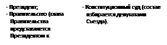 4 октября 1993 г. – Б.Ельцин отдает приказ войскам штурмовать Белый дом. Здание обстреливают танки. В результате Съезд народных депутатов прекращает работу. Руководители и защитники Белого дома арестованы. Итогами «черного октября» стали многочисленные (более 200 человек) жертвы среди гражданского населения.В России была ликвидирована вся структура Советской власти, «двоевластие» - между Законодательной (Съезд народных депутатов) и Исполнительной (Президент) властями закончилось. В России установился авторитарный режим Б. Н. Ельцина. Деятельность Конституционного суда была приостановлена. Был ликвидирован пост вице-президента. 12 декабря 1993 г. был проведен референдум по принятию новой Конституции. В тот же день были проведены выборы депутатов в Государственную думу и Совет Федерации — палаты нового парламента. Согласно новой конституции в России устанавливалась смешанная республика с двухпалатным парламентом и сильной президентской властью. Президент как глава государства является одновременно Верховным Главнокомандующим Вооруженными Силами РФ и гарантом Конституции РФ. Он назначает выборы, распускает Государственную Думу, вносит в нее законопроекты, подписывает указы и распоряжения. Президент назначает с согласия нижней палаты парламента Председателя Правительства РФ, а также его заместителей и федеральных министров. В полномочия Президента входит также формирование Совета Безопасности, Администрации Президента и Совета Обороны, назначение и освобождение полномочных представителей Президента, высшего командования Вооруженных Сил, дипломатических представителей России за рубежом. Президент РФ избирается на 4-летний срок, не более двух сроков подряд. Отрешение от должности Президента РФ, хотя и предусмотрено Конституцией, но весьма сложно и не определено. Совет Федерации - верхняя палата Федерального Собрания - формируется из представителей субъектов Федерации (по два представителя от местной власти), образует комитеты и комиссии, утверждает указы Президента РФ, по представлению Президента назначает судей Конституционного Суда, Верховного Суда, Высшего Арбитражного Суда, назначает и освобождает от должности Генерального прокурора РФ, заместителей Председателя Счетной палаты. Государственная Дума - нижняя палата Федерального Собрания - избирается в составе 450 депутатов на 4-летний срок на постоянной основе. Государственная Дума образует комитеты и комиссии, принимает федеральные законы.