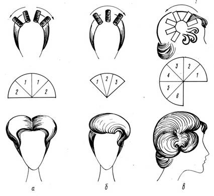 Рис. 43. Получение эффекта углубление - выпуклость за счет различной длины начала прядки вертикальных кольцевых локонов и различных направлении их накручивания: а - выпуклость; б - углубление; в - комбинация углубление – выпуклость