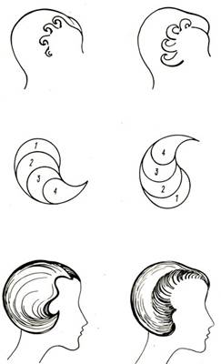 Располагая кольцевые локоны в горизонтальной плоскости рядами и закручивая локоны одного ряда по часовой стрелке, другого - против и т. д., можно организовать попеременное изменение направления волос в пряди (в рисунке), т. е. получить прилегающие волны. Изменяя длину начала прядки кольцевого локона (в каждом ряду одинаково), можно несколько нюансировать форму волн, получая при расчесывании некоторые выпуклости и, следовательно, углубления. Сочетая ряды горизонтально лежащих кольцевых локонов с рядами локонов, расположенных в вертикальной плоскости, изменяя объемность, можно еще больше варьировать формы волн. Устанавливая необходимую длину начала прядок у оснований, можно довольно уверенно нюансировать формы, при необходимости последовательно быстро или медленно увеличивая или уменьшая их величину, довольно точно придавая изменению форм заранее планируемый ритм.