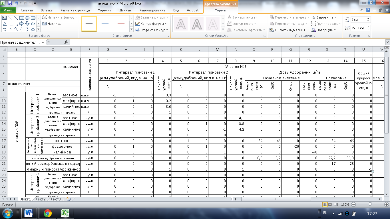 Разработанная экономико-математическая модель может быть решена симплексным методом, так как является задачей линейного программирования Общий принцип, которых таков: выбирается неоптимальный опорный план и его параметры варьируются с целью последовательного улучшения плана, т.е. оптимизации целевой функции при соблюдении всех ограничений, что дает возможность решать оптимизационные задачи. Рассмотренная задача решена с использованием приложения Поиск решения МSExcel. Для решения задачи требуется внести в таблицу на рабочем листе МSExcelследующие данные (рис. 1,1а, 2,2а): 1) технико-экономические коэффициенты при переменных (по столбцам модели № 1...30): а. переменные в столбцах модели № 1...15 отнесены к блоку участка №1; Ь. переменные в столбцах модели № 16...30 - к участку № 2; 2) ограничения (по строкам модели № 1...34): а. по участкам: i. ограничения № 1...14 характеризуют участок № 1, в том числе по интервалам прибавки урожайности: 1. ограничения № 1…4 - по 1-му интервалу; 2. ограничения № 5...8 - по 2-му интервалу; ii. ограничения № 15...28 характеризуют участок № 2, в том числе по интервалам прибавки урожайности: 1. ограничения № 15...18-по 1-ну интервалу; 2. ограничения № 19...22 - по 2-му интервалу; Ь. по фондам удобрений: ограничения№ 29...32: с. по объемам производства продукции: ограничения Ме 33, 34; 3) вводятся коэффициенты целевой функции при свободных переменных; 4) рассчитываются суммы значений по строкам; 5) вызов Данные-Поиск решения, далее - задать целевую ячейку (здесь АМ43), цель –«максимальное значение». Далее указывается массив изменяемых переменных и вводятся ограничения (рис. 3); 6) просмотр подменю Выберите метод решения, указывается Поиск решения линейных задач симплексным методом; запуск выполнения программы команда «Найти решение»; 7) появление измеренных значений переменных (рис. 4, строка 44) и значения целевой функции на экране (рис 4, АМ43).