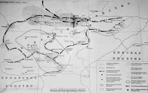 В начале 19 века Кыргызстан попадает во власть Кокандского ханства. Кокандский период вошел в историю Кыргызстана как период налогов, гнета, произвола, восстаний. Одним из главных руководителей борьбы против кокандского гнета был манап рода солто Чуйской долины Байтик Баатыр. В 1860 году принял подданство России. Он возглавлял восстания против кокандских завоевателей, учавствовал с русскими экспидиционными силами в разгроме крепостей Пишпек, Токмок, Мерке, Аулие-Ата. Был награжден орденом Станислава 3-й степени и золотой медалью с Анненской лентой. Торговые пути Восточного Туркестана проходили через Кыргызстан, и правители Кокандского ханства стремились установить свой контроль над ними. В этот период ислам стал распространятся особенно сильно. Кыргызы платили кокандскому хану подать. Не один раз кыргызский народ поднимал восстания. Осенью 1873 года южные кыргызы решают принять подданство России и тем самым избавится от кокандского гнета. Им было отказано в данной просьбе. Но после ряда неудачных восстаний кыргызского народа, российская сторона принимает решение ликвидировать Кокандское ханство путем присоединения его к составу России.