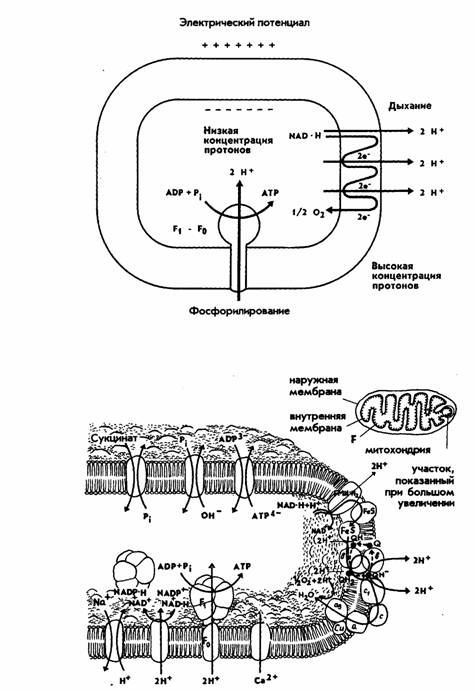 При рассмотрении рисунков надо учитывать, что это лишь предположительная схема расположения переносчиков. Многое в ней нуждается в уточнении. Как видно из приведенной схемы, восстановленный кофермент НАД·Н2,образующийся в реакциях цикла Кребса, располагается на внутренней стороне мембраны митохондрий. На первом этапе ФАД воспринимает водороды от НАД и восстанавливается, образуя ФАД·Н2. С помощью этого фермента 2Н+ переносятся на другую (внешнюю) сторону мембраны, и здесь происходит первое разделение зарядов. Два протона (2Н+) выделяются на внешнюю сторону внутренней мембраны, а электроны присоединяются к переносчику (железосерный белок), с помощью которого переносятся на внутреннюю сторону мембраны. При этом происходит восстановление железа (Fe3++e-→Fe2+). Этот переносчик переправляет электроны снова на внутреннюю сторону мембраны. Здесь электроны акцептируются KoQ (убихинон — переносчик Н), который, заряжаясь отрицательно, захватывает двумя электронами два протона из внутренней среды. Поскольку KoQ растворим в липидах, он диффундирует к внешней стороне мембраны и выделяет там еще 2Н+ (второе разделение зарядов), а электроны передаются на цитохром b. Рассматривая схему, мы указали на два места выделения (всего четырех) протонов. Между тем, согласно хемиосмотической теории, локализация пунктов фосфорилирования в дыхательной цепи определяется пунктами выделения ионов Н+. Поскольку, как указывалось выше, показано наличие трех мест фосфорилирования, то необходима транслокация через внутреннюю мембрану трех пар протонов. Однако точно место выделения третьей пары протонов не установлено. Предполагается, что третья пара Н+ выделяется также при переносе электронов от KoQ (убихинона) к цитохрому b. При этом участвуют 2 молекулы убихинона, которые сначала переходят в полухинон, а затем в гидрохинон (выделяется третья пара Н+). Далее электроны передвигаются по цепи цитохромов b, с, а, а3, содержащих железо. В каждом из них происходят обратимые окислительно-восстановительные превращения железа. На заключительном этапе электроны переносятся ферментом цитохромоксидазой (содержащей наряду с железом медь) на внутреннюю сторону мембраны на кислород. Кислород, заряжаясь, воспринимает 2Н+ из внутренней среды с образованием Н2О. В результате выброса ионов Н+ на внешнюю сторону мембраны митохондрий и создается электрохимический градиент протонов (∆μН+). Таким образом, сам механизм процессов, происходящих на мембранах хлоропластов и митохондрий, сходен. Однако имеются два основных отличия: 1) в случае хлоропластов источником энергии потока электронов служит энергия света, а у митохондрий — энергия окислительных процессов; 2) распределение протонов на мембране противоположно: у митохондрий протоны - накапливаются на наружной стороне, а у хлоропластов — на внутренней. Протонный градиент представляет собой как бы резервуар свободной энергии. Эту энергию можно использовать при обратном потоке протонов через мембрану. При этом происходит разрядка мембраны. В частности, энергия может быть затрачена на синтез АТФ. Процесс синтеза АТФ идет с помощью специальных ферментов — АТФ-синтетаз (АТФ-азы). Этот фермент обратимого действия в зависимости от условий может осуществлять не только синтез АТФ с поглощением, но и ее гидролиз с выделением энергии. АТФ