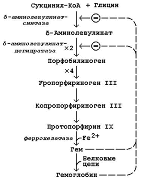 В дальнейшем из четырёх молекул порфобилиногена в результате ряда сложных ферментативных реакций образуется протопорфирин IX – непосредственный предшественник гема. При участии митохондриального фермента феррохелатазы двухвалентное железо включается в уже готовую структуру протопорфирина. Для протекания этой реакции необходимы аскорбиновая кислота и цистеин в качестве восстановителей. Ингибитором феррохелатазы является свинец. На заключительном этапе происходит соединение гема с белковыми цепями, характерными для синтезируемого хромопротеина. Конечные продукты этого биосинтеза (гем, гемоглобин) подавляют начальные реакции по механизму отрицательной обратной связи (рисунок 9).