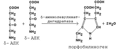 Во второй реакции, катализируемой δ-аминолевулинат-дегидратазой, при конденсации двух молекул δ-аминолевулината образуется порфобилиноген.