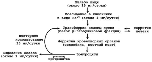 | 26.3.1.В организме человека содержится 4 – 6 г железа. Из этого количества 65-70% приходится на долю гемоглобина. Значительно меньше Fе находится в составе других гемсодержащих белков (миоглобин, цитохромы), а также металлопротеинов (ферритин, трансферрин). Поэтому обмен железа в организме определяется прежде всего синтезом и распадом гемоглобина эритроцитов. Недостаточное поступление железа в организм проявляется в первую очередь как анемия (железодефицитная). Общая схема обмена железа представлена на рисунке 26.2.
