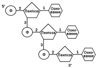 Рисунок 26.4. Схема строения фрагмента полинуклеотидной цепи. Примечание. Пентоза – рибоза в РНК, дезоксирибоза в ДНК. Азотистое основание – аденин, гуанин, цитозин, урацил в РНК, аденин, гуанин, цитозин, тимин в ДНК. Цифрами обозначены типы связей: 1 – N-гликозидные; 2 – сложноэфирные в нуклеотиде; 3 – 3’,5’-фосфодиэфирные (между нуклеотидами).