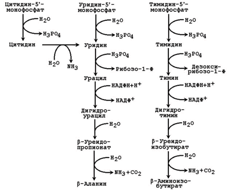 Рисунок 26.6. Катаболизм пиримидиновых нуклеотидов.