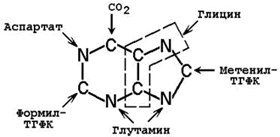 Рисунок 26.7.Происхождение атомов пуринового ядра.