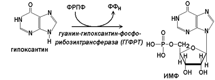 Гипоксантин-гуанин-фосфорибозилтрансфераза(ГГФРТ) катализирует перенос фосфорибозы с ФРПФ на гуанин или гипоксантин: