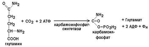 26.9.2.При взаимодействии СО2 и глутамина образуется карбамоилфосфат. Реакция протекает в цитозоле с затратой АТФ.
