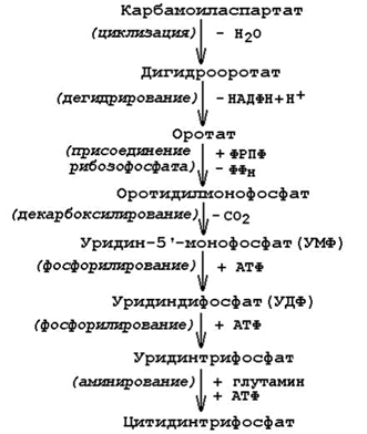 Рисунок 26.10. Схема синтеза пиримидиновых нуклеотидов.