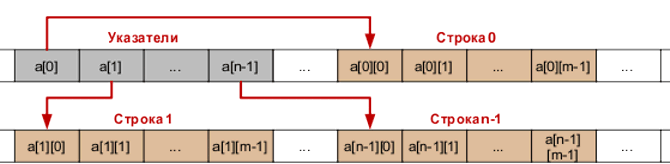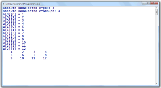 Индекс выделенного элемента определится как index = 1*4+2=6 Объем памяти, требуемый для размещения двумерного массива, определится как n·m·(размер элемента) Однако поскольку при таком объявлении компилятору явно не указывается количество элементов в строке и столбце двумерного массива, традиционное обращение к элементу путем указания индекса строки и индекса столбца является некорректным: a[i][j] - некорректно. Правильное обращение к элементу с использованием указателя будет выглядеть как *(p+i*m+j), где p - указатель на массив, m - количество столбцов, i - индекс строки, j - индекс столбца. Пример Ввод и вывод значений динамического двумерного массива #include<stdio.h> #include<malloc.h> #include<stdlib.h> int main() { int *a; // указатель на массив int i, j, n, m; system("chcp 1251"); system("cls"); printf("Введите количество строк: "); scanf("%d", &n); printf("Введите количество столбцов: "); scanf("%d", &m); // Выделениепамяти a = (int*) malloc(n*m*sizeof(int)); // Ввод элементов массива for(i=0; i<n; i++) // цикл по строкам { for(j=0; j<m; j++) // цикл по столбцам { printf("a[%d][%d] = ", i, j); scanf("%d", (a+i*m+j)); } } // Вывод элементов массива for(i=0; i<n; i++) // цикл по строкам { for(j=0; j<m; j++) // цикл по столбцам { printf("%5d ", *(a+i*m+j)); // 5 знакомест под элемент массива } printf("\n"); } free(a); getchar(); getchar(); return 0; } Результат выполнения