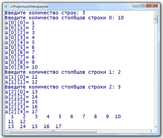 При таком способе выделения памяти компилятору явно указано количество строк и количество столбцов в массиве. Пример #include<stdio.h> #include<malloc.h> #include<stdlib.h> int main() { int **a; // указатель на указатель на строку int i, j, n, m; system("chcp 1251"); system("cls"); printf("Введите количество строк: "); scanf("%d", &n); printf("Введите количество столбцов: "); scanf("%d", &m); // Выделение памяти под указатели на строки a = (int**)malloc(n*sizeof(int*)); // Ввод элементов массива for(i=0; i<n; i++) // цикл по строкам { // Выделение памяти под хранение строк a[i] = (int*)malloc(m*sizeof(int)); for(j=0; j<m; j++) // цикл по столбцам { printf("a[%d][%d] = ", i, j); scanf("%d", &a[i][j]); } } // Вывод элементов массива for(i=0; i<n; i++) // циклпострокам { for(j=0; j<m; j++) // цикл по столбцам { printf("%5d ", a[i][j]); // 5 знакомест под элемент массива } printf("\n"); free(a[i]); // освобождение памяти под строку } free(a); getchar(); getchar(); return 0; } Результат выполнения программы аналогичен предыдущему случаю. С помощью динамического выделения памяти под указатели строк можно размещать свободные массивы. Свободным называется двухмерный массив (матрица), размер строк которого может быть различным. Преимущество использования свободного массива заключается в том, что не требуется отводить память компьютера с запасом для размещения строки максимально возможной длины. Фактически свободный массив представляет собой одномерный массив указателей на одномерные массивы данных. Для размещения в оперативной памяти матрицы со строками разной длины необходимо ввести дополнительный массив m, в котором будут храниться размеры строк. Пример #include<stdio.h> #include<stdlib.h> int main() { int **a; int i,j, n,*m; system("chcp 1251"); system("cls"); printf("Введитеколичествострок: "); scanf("%d", &n); a = (int**)malloc(n*sizeof(int*)); m = (int*)malloc(n*sizeof(int)); // массивкол-ваэлементовстрок // Ввод элементов массива for(i = 0; i<n; i++) { printf("Введите количество столбцов строки %d: ", i); scanf("%d", &m[i]); a[i] = (int*)malloc(m[i]*sizeof(int)); for(j = 0; j<m[i]; j++) { printf("a[%d][%d]= ", i, j); scanf("%d", &a[i][j]); } } // Вывод элементов массива for(i = 0; i<n; i++) { for(j = 0; j<m[i]; j++) { printf("%3d ",a[i][j]); } printf("\n"); } getchar(); getchar(); return 0; } Результат выполнения