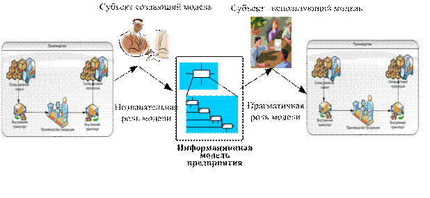 Модели могут играть две роли: познавательную и управленческую (прагматическую). Если перед субъектом поставлена задача разработать модель, то он изучает (объект) оригинал (на рисунке ниже информационный поток направлен от оригинала к субъекту). На основании полученных знаний он создает познавательную модель. Если модель существует, то с ее помощью можно воздействовать на объект, то есть управлять им (на рисунке информационный поток направлен от модели к субъекту, а за тем на объект). В этом случае модель является прагматической.