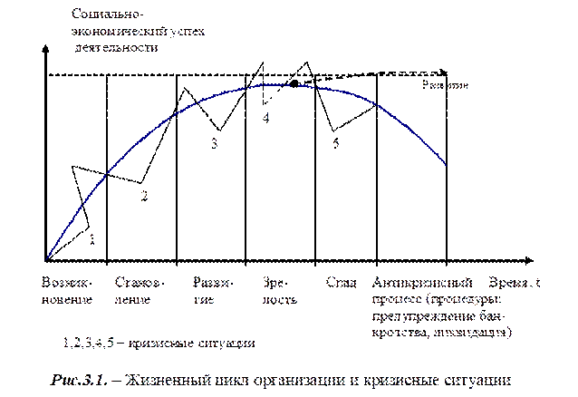 Греческое слово «кризис» означает «решение». В настоящее время понятие кризиса расширилось и применяется к любому резкому переходу, ко всем переменам, воспринимаемым как нарушение непрерывности. Согласно определению, приведенному в Экономической энциклопедии под редакцией Л.И. Абалкина, «Кризис[61] – глубокое расстройство, резкий перелом, период обострения противоречий в процессе развития какой-либо сферы человеческой деятельности». А.А. Богданов в своей «Теории предельного равновесия и кризисов» подразумевает под кризисом «завершение или перелом в ходе некоторого процесса, имеющего характер борьбы: до «кризиса» борьба идет, положение является неопределенным, колеблющимся; момент кризиса есть конец этой неопределенности и колебания – победа одной стороны или примирения обеих: начинается новое, организационно иное, чем прежде»[62]. Любая организация мира в различные периоды существования проходит через кризисы развития. В широком смысле это процесс, который ставит под угрозу существование организации. Зачастую кризисы наступают для руководства организации неожиданно. Однако, как показывает практика, о возникновении кризиса свидетельствует множество симптомов: снижение доходов от реализации продукции (работ или услуг), снижение других показателей финансово-хозяйственной деятельности организации. До 80 % компаний не в состоянии преодолеть подобные кризисы развития и уходят с рынка[63]. Сама возможность кризиса определяется рискованным развитием любой организации, которая существует всегда. В связи с этим целесообразно рассмотреть типологию кризисов в развитии организации, причины и закономерности их возникновения, критерии, характерные для начала кризиса. Практика показывает, что кризисы в организации не только возможны, но и отражают: а) собственные циклы развития организации, б) связаны с циклическим развитием всей социально-экономической системы. Таким образом, функционирование и развитие любой организации происходит циклически. Эти циклы могут переплетаться, накладываться друг на друга или отличаться различными фазами. В процессе развития организации происходит чередование «эволюционных» этапов, на которых происходит количественное изменение параметров деятельности, и «революционных» этапов качественного усложнения структуры, качественных скачков, самоорганизации[64], поднимающей системы вверх по оси сложности. Рост производства продолжается до некоторого момента, пока возможности не оказываются исчерпанными. Дальнейшее увеличение затрат на ресурсы приводит к снижению эффективности, падению производства. В этой точке происходит качественная перестройка системы – скачком возникает более сложная структура, обеспечивающая резкое повышение эффективности производства. На все последующие кризисные моменты система «организация» отвечает самопроизвольным переходом к более сложным структурам с большей эффективностью производства. Промежуточные кризисные ситуации и заключительный кризис в процессе развития и функционирования организации показаны на Рис.3.1.