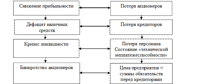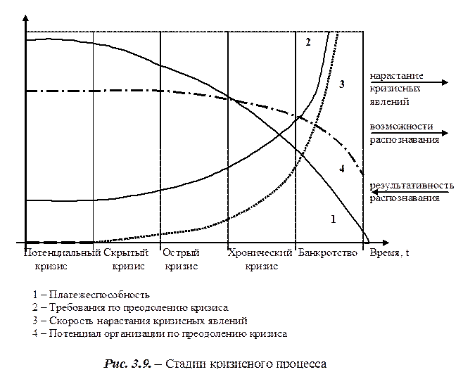 Рис. 3.8. – Кризисный процесс по А.П. Градову и Б.И. Кузину Кризис в широком смысле – это неотъемлемая характеристика рыночной экономики. Исходя из этого положения, З. Айвазян и В. Кириченко считают, что любое управление является антикризисным, а содержание и методы эффективного (обычного) и антикризисного управления не отличаются. Первая фаза кризиса – снижение рентабельности и объемов прибыли (кризис в широком смысле). Кризис организации начинается со снижения рентабельности и объемов прибыли, что приводит к ухудшению финансового положения организации, сокращению источников и резервов развития. Решение проблемы может лежать как в области стратегического управления (пересмотр стратегии, реструктуризация организации), так и тактического (снижение издержек, повышение производительности). Вторая фаза кризиса – убыточность производства. Следствием снижения и потери рентабельности и объемов прибыли, по мнению авторов, служит убыточность производственной деятельности организации. Что в свою очередь приводит к уменьшению резервных фондов организации (если таковые имеются – в противном случае сразу наступает третья фаза). Решение проблемы находится в области стратегического управления и реализуется, как правило, через реструктуризацию организации. Третья фаза кризиса – истощение или отсутствие резервных фондов. Убыточность производства приводит к тому, что на погашение убытков организация направляет часть оборотных средств и тем самым переходит в режим сокращенного воспроизводства. Реструктуризация уже не может быть использована для решения проблемы, так как отсутствуют средства на ее проведение. Здесь должны приниматься оперативные меры по стабилизации финансового положения организации и поиска средств на проведение реструктуризации. В случае если такие меры не принимаются, или их применение оказалось неудачным, организация оказывается в четвертой (последней) фазе кризиса. Четвертая фаза кризиса – неплатежеспособность. Организация оказывается в ситуации, когда у нее нет средств поддерживать даже сокращенное воспроизводство и платить по предыдущим обязательствам. Возникает угроза остановки производства и банкротства. Необходимы экстренные меры по восстановлению платежеспособности организации и поддержанию производственного процесса. Для третьей и четвертой фаз кризиса характерны нестандартные, экстремальные условия функционирования организации, требующие срочных вынужденных мер. Ключевым моментом здесь является наступление или приближение неплатежеспособности. Именно эта ситуация, по мнению З. Айвазяна и В. Кириченко, и должна быть объектом антикризисного управления. Последние два подхода несомненно представляют собой более конкретный и практический инструмент для идентификации стадий кризиса в организации (количественные переменные) и выработки эффективных мер по его преодолению, но кроют в себе существенный недостаток: они не рассматривают самых начальных стадий, когда нет видимых симптомов, а только их качественно характеризуют. Обобщив все вышеперечисленные точки зрения различных авторов на разделение кризисного процесса на стадии, приведем свою точку зрения по данному вопросу. Разделение кризиса на различные фазы необходимо, так как кризис – это не статическое состояние, а процес