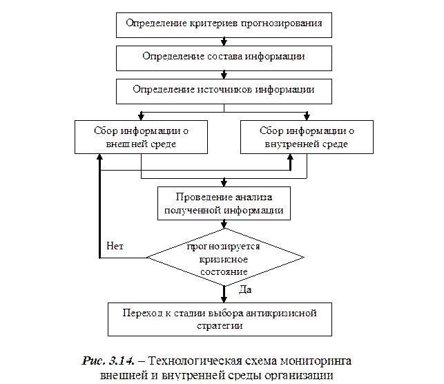 Тот или иной вид антикризисного управления (реактивное или опережающее) применяется в зависимости от того, находится ли организация в острой стадии кризиса или осуществляет антикризисное управление с целью профилактики кризиса и распознавания его на ранних стадиях.[99] Опережающее преодоление кризиса включает в себя прогнозирование кризисов и их распознавание на ранних стадиях, а реактивное – выявление причин уже наступившего кризиса и вывод организации из него. Для эффективной борьбы с кризисами, управление организацией должно быть больше ориентировано на опережающее (априорное) управление, чем на реактивное, на меры по распознаванию, прогнозированию кризисов на ранних стадиях и предупреждению («профилактику болезни»), чем на «реанимацию» попавшей в острый кризис организации. Нами разработана общая схема антикризисного управления организацией, которая состоит из четырех основных блоков (Рис. 3.13): 1. Стадия стратегического анализа. На данном этапе осуществляется сбор данных и анализ внешней и внутренней среды организации, прогнозирование вероятности возникновения кризиса или диагностика самого кризиса (такой мониторинг должен проводиться в организации непрерывно), а также анализ причин потенциального или уже наступившего кризиса. 2. Стадия выбора стратегии. На этой стадии планируются и проводятся мероприятия по подготовке к кризису, пересматриваются и корректируются миссия и цели организации, а также производится выбор стратегии преодоления кризиса из нескольких предложенных вариантов. 1) Первые два блока составляют стратегическую часть антикризисного управления. 3. На третьей стадии – стадии реализации стратегии – разрабатывается стратегический проект антикризисных мероприятий, вырабатывается план действий, и производится выбор тактических мероприятий по реализации выбранной стратегии. 4. Стадия оценки реализации стратегии – последний этап антикризисного управления, на котором происходит мониторинг управленческих решений, а также анализ и оценка полученных результатов. Последние два блока относятся к тактическому (оперативному) планированию в рамках антикризисной программы организации. Одним из важнейших этапов антикризисного управления, является этап стратегического анализа. Мониторинг должен составлять неотъемлемую часть этого процесса и осуществляться непрерывно. Технологическая схема мониторинга представлена на Рис. 3.14. Сначала определяются критерии прогнозирования кризиса и критерии диагностики реального кризиса, которые могут корректироваться в процессе накопления опыта. В соответствии с выделенными критериями определяется состав информации о внутренней и внешней среде организации и источники для ее сбора. Далее происходит сбор и проверка на достоверность собранной информации. Следующий этап – это анализ собранной информации. Здесь производится сопоставление фактических данных с плановыми и нормативными, экспертные оценки и т.д.