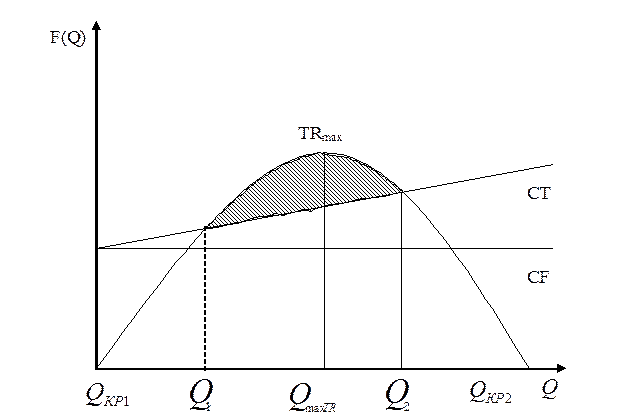 Рис. 4.2. – Область доходной деятельности организации и кризисные точки[122] Разница между полным доходом и полными издержками определяет прибыль организации. Область, заштрихованная на Рис. 4.2 – это прибыль. Функция прибыли будет выглядеть следующим образом: