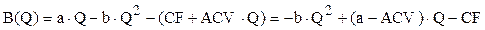 Предполагается, что такой многоаспектный анализ позволяет раскрыть и оценить взаимодействие организационных, управленческих, экономических, финансовых и других процессов, а в результате формируется объемное представление о кризисе, направлении и характере его развития в организации. Неравномерность изменения наблюдаемых показателей в периоде говорит об утрате устойчивости организации и развитии кризиса. Достоинством данного подхода является попытка выйти за рамки чисто финансового оценивания кризисного развития и придать диагностике кризиса многоаспектность. Долятовский В.А. для прогнозирования и диагностики кризисов предлагает использовать детерминированную и статистическую модели устойчивости организации[121]. Автор исходит из положения о том, что крайние точки диапазона устойчивой работы организации, определенные им математически, являются так называемыми кризисными точками, с которых начинается развитие кризиса в организации. И определение этих точек позволяет не только прогнозировать и диагностировать кризисы, но и планировать антикризисные мероприятия. Детерминированная модель устойчивости организации. Предполагается, что в краткосрочном периоде времени постоянные издержки (CF) и средние переменные издержки на выпуск единицы продукции (ACV) являются константами, однако в долгосрочном периоде они могут изменяться. Кроме того, в условиях совершенной конкуренции рыночная цена продукции является внешним фактором. Тогда прибыль организации в краткосрочном периоде является функцией объема товара (при допущении, что вся производимая продукция реализуется по рыночной цене). Тогда функция прибыли может быть записана следующим образом: