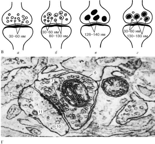Продолжение В - схема строения синаптических пузырьков: А - холинергических (светлых); Б - адренергических; В - пуринергических; Г - пептидергических (по Л. Д. Маркиной); Г - электронная микрофотография аксодендритного синапса (препарат И. Г. Павловой). Аксосоматический синапс; Аксодендритные синапсы; Аксоаксональный синапс; Дендриты; Дендритный шипик; Аксон; Синаптические пузырьки; Пресинаптическая мембрана; Постсинаптическая мембрана; Синаптическая щель; Постсинаптические уплотнения Date: 2015-07-17; view: 953; Нарушение авторских прав |