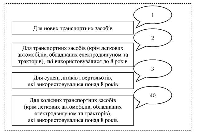 З прийняттям Податкового кодексу України збір за першу реєстрацію транспортного засобу замінив податок з власників транспортних засобів та інших самохідних машин і механізмів. Розділом VII Податкового кодексу передбачений інноваційний підхід до справляння цього збору - тепер його сплата здійснюється лише при першій реєстрації транспортного засобу в Україні (скасована сплата при проходженні транспортними засобами чергового технічного огляду, їх реєстрації та перереєстрації). Отже, платниками збору є юридичні та фізичні особи, які здійснюють першу реєстрацію в Україні транспортних засобів. Об'єктом оподаткування є: 1. Колісні транспортні засоби, крім: а) транспортних засобів, закріплених за військовими частинами, військовими навчальними закладами, установами та організаціями Збройних Сил України; підрозділами охорони громадського порядку, забезпечення громадської безпеки, безпеки дорожнього руху; підрозділами служби цивільного захисту; б) транспортних засобів, що використовуються на заводах, складах, у портах та аеропортах для перевезення вантажів на короткі відстані; в) транспортних засобів швидкої медичної допомоги; г) машин і механізмів для сільськогосподарських робіт; г') причепів (напівпричепів); д) мопедів; е) велосипедів. 2. Судна, зареєстровані у Державному судновому реєстрі України або у Судновій книзі України 3. Літаки і вертольоти, зареєстровані у Державному реєстрі цивільних повітряних суден України або у Реєстрі державних повітряних суден України, крім: а) літаків і вертольотів Збройних Сил України; б) літаків і вертольотів органів управління та сил цивільного захисту населення. База оподаткування збором встановлюється окремо для кожного транспортного засобу (рис. 13.11).